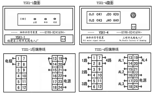 YSX1油積水信號裝置安裝于油箱底部。當(dāng)油箱內(nèi)油混有水并沉積于底部電極裝置時,信號裝置內(nèi)的集成控制電路能發(fā)出報警信號,運(yùn)行人員可打開電極裝置的Gl/4直嘴旋塞把水放掉。YSX1-1為一路監(jiān)測配套儀表;YSX1-4為4路監(jiān)測配套儀表。