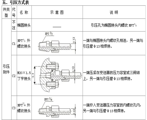 例:TDSB3051差壓變送器,量程0-300kpa,兩線制4~20 mA DC信號輸出,法蘭接頭、排氣/排液閥、隔離膜片均為316不銹鋼,智能表顯示器,管裝平支架,泄放閥在壓力室側(cè)面的上部,橢圓接頭內(nèi)螺紋NPT 1/2